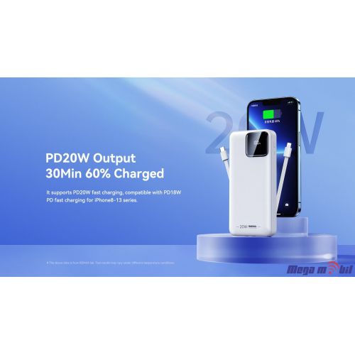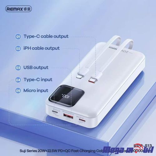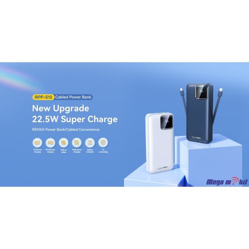 Product name: RPP-512 Cabled Power Bank with Digital Display 20000mAh Battery type: Lithium polymer Battery capacity: 20000mAh Size: 146.8*68*31.6MM Net weight: 419g