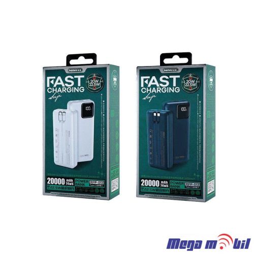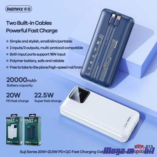 Product name: RPP-512 Cabled Power Bank with Digital Display 20000mAh Battery type: Lithium polymer Battery capacity: 20000mAh Size: 146.8*68*31.6MM Net weight: 419g