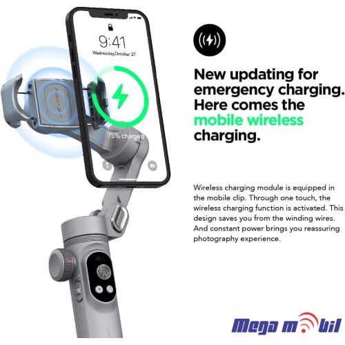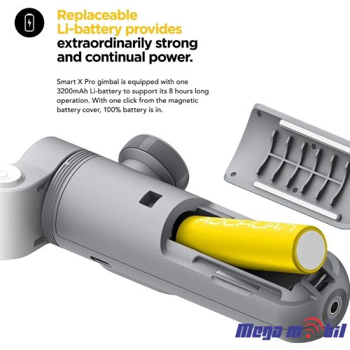 3. Replaceable Li-battery Provides Extraordinarily Strong and Continual Power: X Pro gimbal is equipped with one 3200mAh Li-battery to support its 8 hours long operation. With one click from the magnetic battery cover, 100% battery is in; Also it supports wireless charging for your mobile Phones.