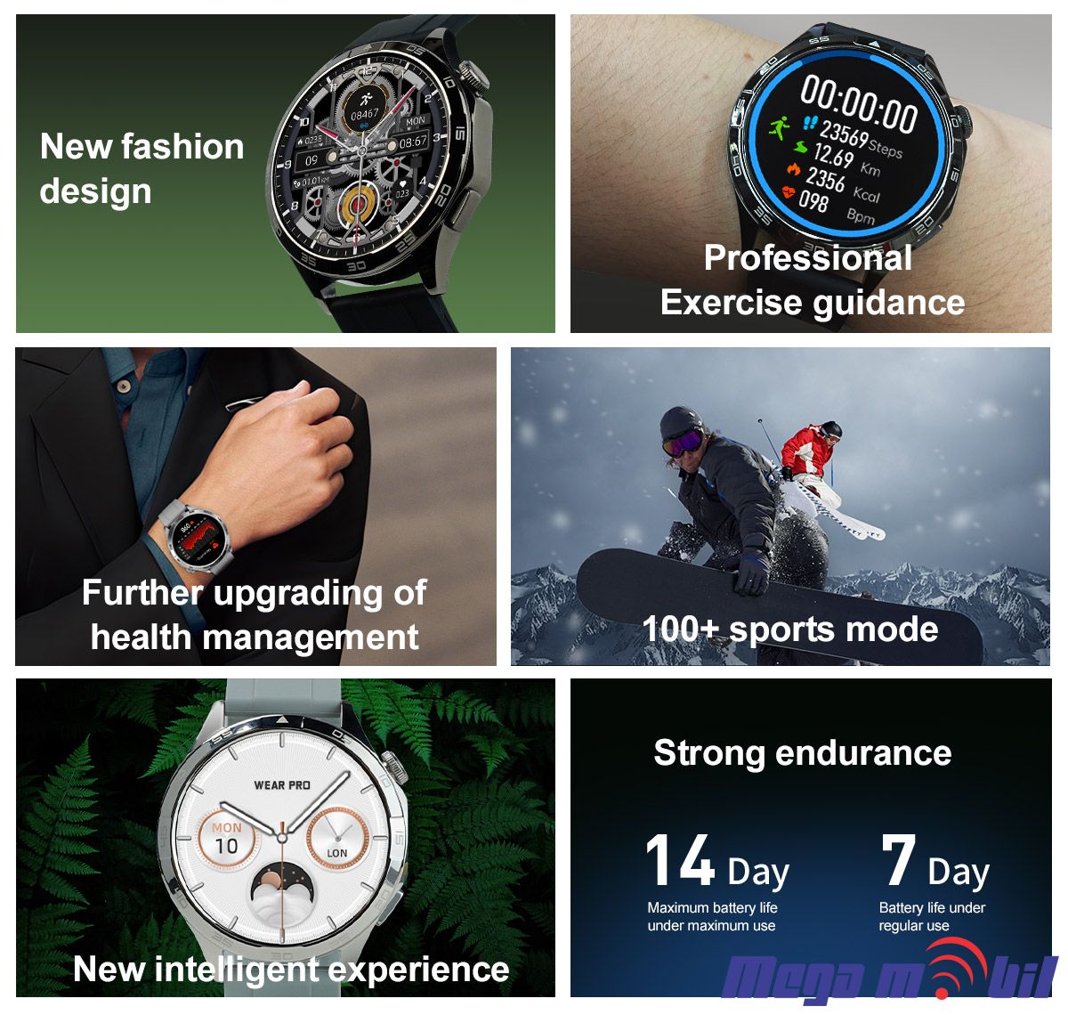 Функции: Bluetooth повици, 11 менија, вежби за дишење, штоперица, прилагодување на осветленоста, повеќе спортски режими, следење на спиењето, следење на отчукувањата на срцето, пораки, контрола на музиката, контрола на камерата, временска прогноза, опција за пронаоѓање телефон, заштита со лозинка, калкулатор, опција за поделен екран, GPS, аларм, фенерче, компас, игри