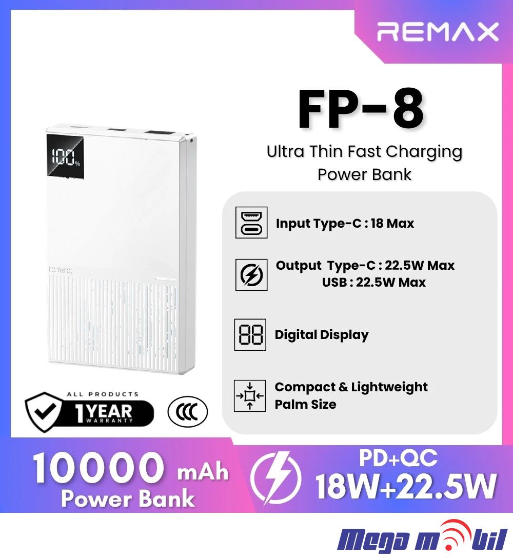 Baterija eksterna 10000mAh REMAX Ultra Thin FP-8 FAST 22.5W white
